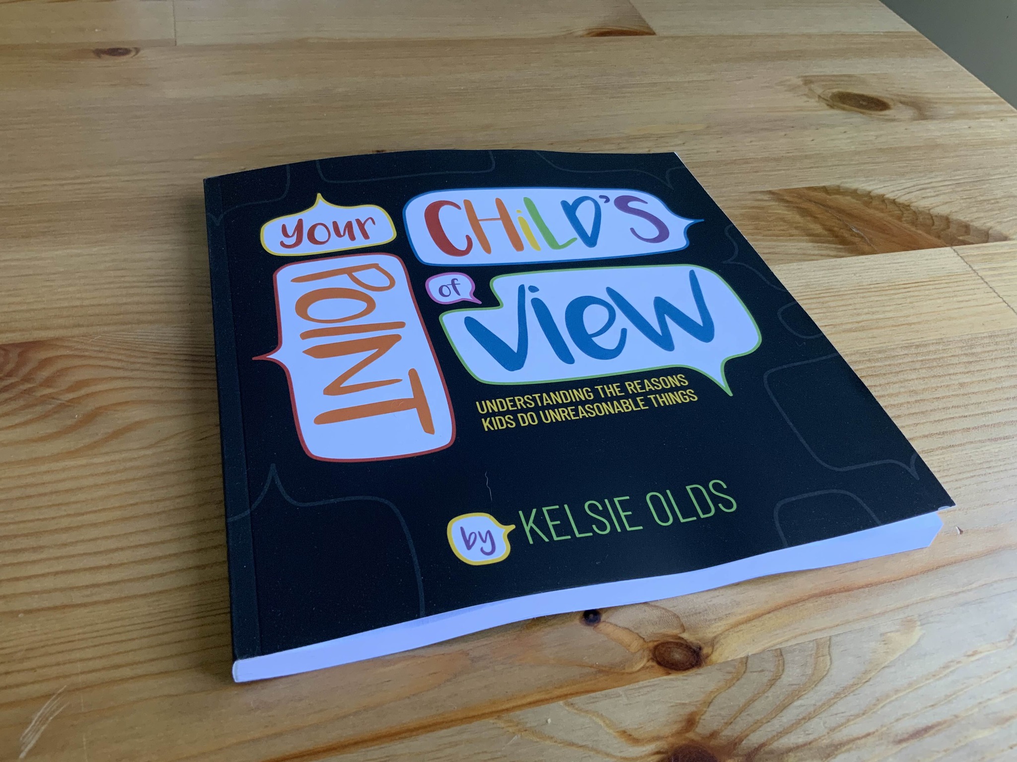 A very lovely picture of my book from a slanted angle on a wooden table backdrop. The cover is black with the title in pops of rainbow colors, “Your Child’s Point of View,” in word bubbles coming from all angles. Beneath that it’s subtitled “Understanding the Reasons Kids Do Unreasonable Things,” and also says “by Kelsie Olds”. End description.]