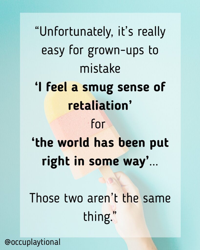 image description: a picture of a popsicle faded in the background with a quote from this article on it. “Unfortunately, it’s really easy for grown-ups to mistake ‘I feel a smug sense of retaliation’ for ‘the world has been put right in some way’… those two aren’t the same thing.” End description.